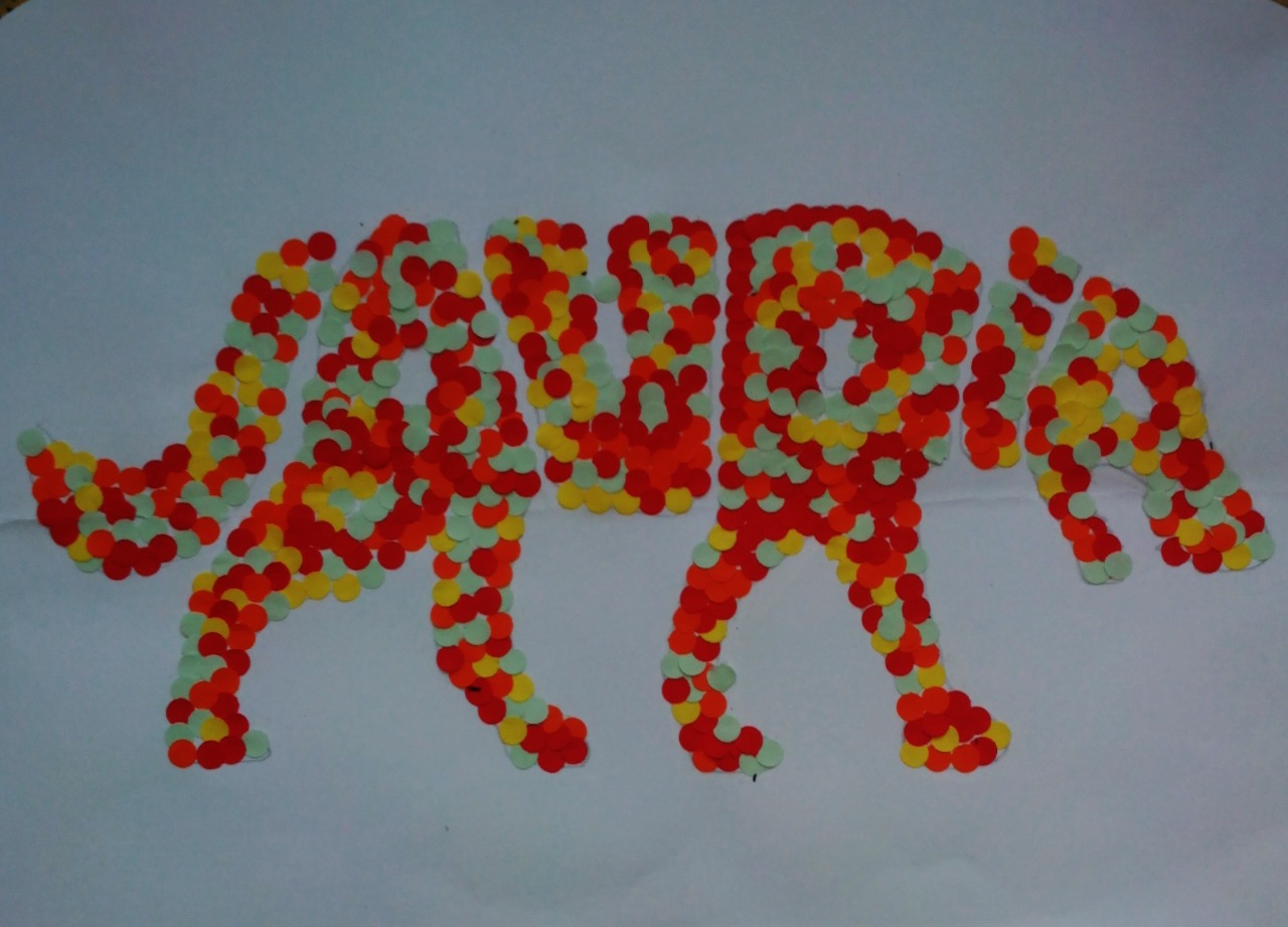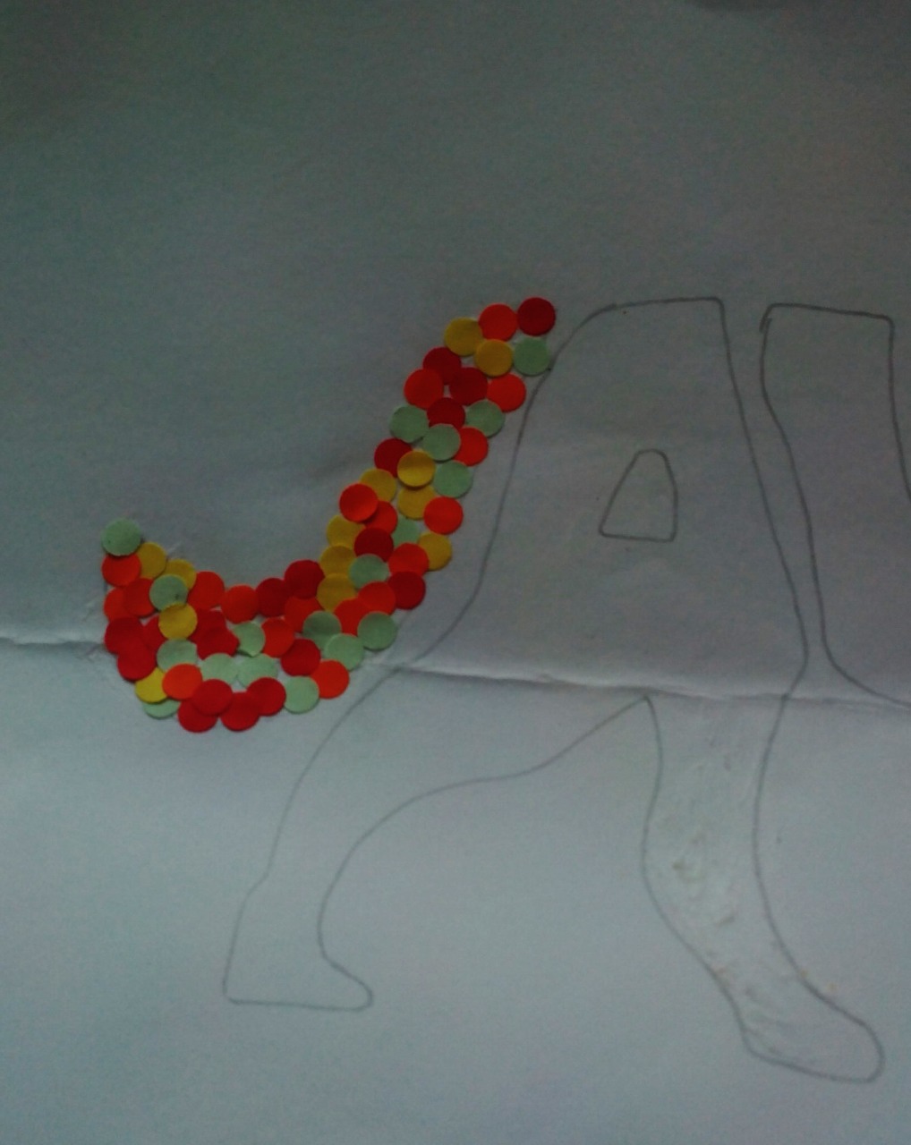 El tercer paso es el de pegar los círculos en cada una de las letras. Para ello utilizaremos pegamento de barra y con mucha paciencia iremos pegando uno a uno los círculos de colores.